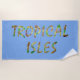 Mosaïque, texte graphique, "Îles tropicales", qui signifie, un lieu fictif, imaginaire exposé dans un exotique, île motif en ; orange, vert olive, jaune, taupe, marron, noir et blanc.