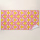 Cette serviette de plage a un design géométrique de triangles roses et oranges répétées avec des cercles jaunes sur un champ de blanc cassé. Voulez-vous le même design dans des couleurs différentes? Message-moi.
