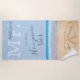 M. Dusty Blue Beach Mariage 2 Coeurs Sable | Son Beach Towel avec les noms de mariés de nouveau "Villes lune de miel", serviette de plage.