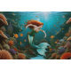 "Marielle" - Belle Sirène Dansante. Ballet aquatique : Dans cette image fascinante, une sirène étonnante aux cheveux rouges coule gracieusement sur le fond marin, sa queue de poisson verte et bleue scintillant dans l'eau. Entourée d'un jardin sous-marin de poissons et de coraux, elle semble se déplacer au rythme des airs aquatiques doux. La scène, remplie de subtiles teintes multicolores, capture la sérénité et la fluidité de cet art pré-raphaélite stylisé. Avez-vous déjà vu une danse de sirène si élégamment dans la mer bleue profonde ?