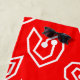 Cette serviette de plage a un design moderne du milieu du siècle Valentin de mazes de coeur blanc éparpillés sur un champ de rouge.