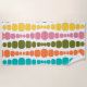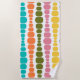 Cette serviette de plage a un design moderne du milieu du siècle de lignes verticales de rectangles arrondis de taille croissante et décroissante dans les couleurs rétro de rouge, vert, bleu, jaune, orange et marron sur un champ de blanc.
