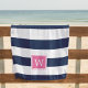 Preppy chic monogrammed serviette de plage en rose et marine dispose de larges bandes bleu marine et blanc classique, avec votre unique monogramme initial centré au fond dans vibrante, rose bonbon d'été.
