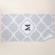Serviette de plage grise avec un motif de quatrefoil marocain blanc et monogramme personnalisé au centre.
