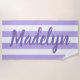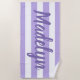 Le design personnalisé des serviettes de plage comprend du texte personnalisé dans un script violet moderne qui peut être personnalisé avec un prénom ou un nom de famille contre un motif de rayures blanches sur un arrière - plan violet clair. Les couleurs et le style de police peuvent être complètement customisés.