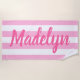 Le design personnalisé des serviettes de plage comprend du texte personnalisé dans un script moderne girly rose chaud qui peut être personnalisé avec un prénom ou un nom de famille contre un motif de rayures blanches sur un arrière - plan rose clair. Les couleurs et le style de police peuvent être complètement customisés.