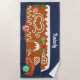 Cette serviette de plage personnalisée fait un cadeau de Noël parfait pour les propriétaires de VR. Il présente une illustration d'un RV en pain d'épices. Ce camping-car festif est décoré de cerise blanche et de bonbons rouges et verts et est dressé contre un arrière - plan bleu marine. La serviette est prête à être personnalisée avec un nom ou un autre texte personnalisé en haut.