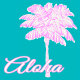 Palmiers roses et blancs et texte d'aloha sur un arrière - plan turquoise. Un look tropical estival amusant pour votre piscine de jardin ou la plage cet été.