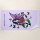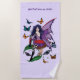 Jolie fée aux cheveux noirs tout en violet et rouge assis sur un champignon dans un fond de violet