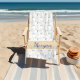 De superbes images vintage d'étoiles de mer dans le sable beige et blanc, des coquillages bleu marine et des coraux de ventilateur bleu clair sont disposées sur un arrière - plan blanc pour faire de cette serviette de plage personnalisée, élégante, claire et aérée, sur le thème de la plage, prête à customiser avec votre nom ou tout message de votre choix.