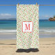 Serviette de plage monogrammée avec un monogramme rose au centre sur un motif botanique de palmier tropical vert feuille et fleurs exotiques roses.
