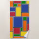 Cette serviette de plage a un design Bauhaus de rectangles formés de lignes grises et remplis de rouge, jaune, orange, bleu et vert sur un champ de noir.