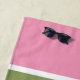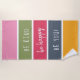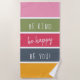 Toile de plage rayée à palette de couleurs avec citation positive. Le texte dit : "Soyez heureux d'être vous !" et est écrit en écriture manuscrite et en typographie capricieuse. Le design est composé de 5 rayures colorées en rose, vert, cerise, bleu et jaune. Un design heureux et gai pour le jardin, la piscine ou la plage. Veuillez naviguer dans mon magasin pour coordonner les sacs et les coussins extérieurs.