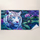tigre blanc aux yeux bleus dans les feuilles tropicaux et les fleurs violettes AI Art par minx267