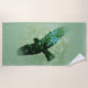 Cette serviette de plage personnalisée est verte avec une photo modifiée d'une corneille noire volante transparente avec des cimes d'arbres visibles derrière son corps.