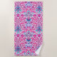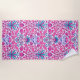 Serviette de plage dans un vintage William Morris motif de jacinthes, tulipes et feuilles, dans les tons fuchsia et rose pâle, accentué de bleu foncé et turquoise, sur un arrière - plan blanc