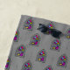 Dessin graphique, d'un bleu-gris, de forme gothique, fenêtre, dans les couleurs de ; bleu, violet, fuschia, gris et or, contre un gris foncé, simulant l'arrière - plan, un vitrail, fenêtre de l'église.