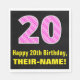Cette conception amusante et joyeuse de serviette en papier à thème d'anniversaire dispose d'un grand nombre "20" avec un motif rayé rose clair et rose foncé contenant des formes cardiaques. Il comporte également le message de voeux d'anniversaire "Joyeux 20e anniversaire", et un nom personnalisable. Des serviettes en papier comme celle-ci pourraient être agréables à avoir lors d’une fête en l’honneur du vingtième anniversaire de quelqu’un. Cela pourrait aussi être un choix amusant pour quelqu'un qui a un anniversaire qui tombe le 14 février (Saint-Valentin), en raison de ses symboles et couleurs de coeur aimés. [~Z0000436]
