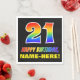 Cette serviette de papier d'anniversaire joyeuse, amusante et colorée présente un grand nombre de "21" et le message "HAPPY BANTHDAY", tous deux dotés d'une couleur motif inspirée par un gradient de spectre arc-en-ciel, ainsi qu'un nom de destinataire personnalisé jaune gras. L'arrière - plan est noir de couleur. Des serviettes en papier sur le thème de l’anniversaire comme celle-ci pourraient être amusantes à utiliser lors d’une fête organisée pour célébrer le 21e anniversaire de quelqu’un. [~Z0000476]