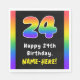 Cette serviette en papier joyeuse et joyeuse à thème d'anniversaire comporte le numéro "24" avec un motif multicolore inspiré du spectre arc-en-ciel, ainsi que le message "Joyeux 24e anniversaire", et un nom de destinataire personnalisable. Des serviettes en papier sur le thème de l’anniversaire amusant comme celles-ci pourraient être utilisées lors d’une fête d’anniversaire célébrant le vingt-quatrième anniversaire de quelqu’un. [~Z0000629]