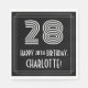 Cette serviette en papier d'anniversaire inspirée des années folles comporte un grand look Art Déco inspiré du numéro "28", le message "HAPPY 28th BIRTHDAY", un nom modifiable, et un motif de frontière composé de lignes. Des serviettes en papier customisées et amusantes comme celle-ci pourraient être utilisées lors d’une célébration d’anniversaire en l’honneur du vingt-huitième anniversaire de quelqu’un. [~Z0000395]