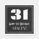 Cette apparence des années 20 Roaring a inspiré l'apparence vintage sur le thème de l'anniversaire de conception de papier napkin avec un grand style art déco inspiré numéro "31", le message "Happy 31st Birthday," un nom personnalisable, et un motif de bordure composé de lignes fines. Des serviettes en papier amusantes et customisées sur le thème de l’anniversaire, comme celle-ci, pourraient être utilisées lors de la célébration du 31e anniversaire de quelqu’un. [~Z0000494]
