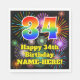 Cette conception amusante et joyeuse de serviette en papier sur le thème de l'anniversaire comporte un grand nombre de "34" avec un dégradé coloré de l'arc-en-ciel inspiré motif, avec le message "Happy 34th Birthday,", et un nom personnalisé. L'arrière - plan est décoré d'un motif vibrant et coloré, inspiré par les feux d'artifice des célébrations. Des serviettes en papier colorées sur le thème de l’anniversaire, comme celle-ci, pourraient être utilisées à une fête pour célébrer le trente-quatrième anniversaire de quelqu’un. [~Z0000574]