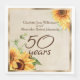Ces élégantes serviettes de célébration du 50e anniversaire de mariage doré présentent un magnifique thème floral aquarelle. Deux bouquets de tournesols sont imprimés de chaque côté du texte. Un cadre doré borde la zone de texte. L'arrière - plan est un motif de papier parchemin rustique. Deux exemples de noms sont imprimés au-dessus des 50 ans. Vous pouvez les personnaliser pour y inclure vos propres noms et votre année anniversaire.