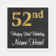 Ce design luxueux, élégant et sophistiqué de serviette d'anniversaire comporte un grand numéro ordinal "52nd" avec une imitation/faux look or, plus le message de voeux d'anniversaire "Happy 52nd Birthday," et un nom personnalisé dans une police de style script. L'arrière - plan est noir de couleur. Des serviettes en papier à thème comme celle-ci peuvent être utilisées lors d’une fête pour célébrer le 52e anniversaire de quelqu’un. [~Z0000516]