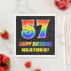 Cette conception amusante, joyeuse et colorée de serviette en papier à thème d'anniversaire comporte un grand nombre de "57" et le message "HAPPY BANTHDAY", tous deux ayant un dégradé arc-en-ciel de couleur motif inspirée, ainsi qu'un nom de destinataire personnalisé jaune gras. L'arrière - plan est noir de couleur. Des serviettes en papier amusantes et modifiables comme celle-ci pourraient être utilisées lors d’une célébration pour célébrer le 57e anniversaire de quelqu’un. [~Z0000476]