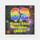 Ce design captivant et gai de papier d'anniversaire est doté d'un grand nombre de "62" avec un dégradé coloré du spectre arc-en-ciel inspiré motif, avec le message "Happy 62nd Birthday," et un nom personnalisé. L'arrière - plan présente un motif multicolore inspiré par les feux d'artifice de célébrations éclatants. Des serviettes en papier colorées sur le thème de l'anniversaire comme celle-ci pourraient être utilisées à une fête pour quelqu'un qui célèbre son soixante-deuxième anniversaire. [~Z0000574]