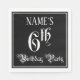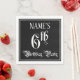 Cette serviette en papier élaborée et opulente, sur le thème de l'anniversaire, porte un nom personnalisé et le message "6e fête d'anniversaire". Le grand numéro "6ème" et les mots "fête d'anniversaire" sont dans un texte de style script sophistiqué. L'arrière - plan est coloré en noir par défaut (bien qu'il puisse être customisé). Des serviettes en papier sophistiquées comme celle-ci pourraient être utilisées lors d’une célébration d’anniversaire pour honorer le sixième anniversaire de quelqu’un. [~Z0000563]