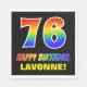 Cette serviette en papier colorée, joyeuse et amusante à thème d'anniversaire comporte un grand nombre de "76" et le message "HAPPY BANTHDAY", tous deux colorés avec un motif inspiré par un gradient de spectre arc-en-ciel, ainsi qu'un nom de destinataire personnalisé jaune gras. L'arrière - plan est noir de couleur. Des serviettes en papier sur le thème de l’anniversaire comme celle-ci pourraient être utilisées pour célébrer le 76e anniversaire de quelqu’un. [~Z0000476]