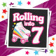 Ce design de fête de patinage est parfait pour une fête de patinage à rouleaux ou un thème d'anniversaire pour une fille de 7 ans. Si la fille d'anniversaire aime le roller skate, elle ADORE ce skate party design! Caractéristiques style rétro 'Rolling in 7' anniversaire citation avec roller cool graphique avec arc-en-ciel & étoiles qui est amusant et unique. Fun roller skate design pour le 7ème anniversaire d'une fille!