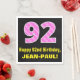 Ce modèle de serviette en papier à thème d'anniversaire joyeuse et amusante comprend un grand numéro "92" avec un motif rayé contenant des formes cardiaques colorées rose pâle et rose foncé. Il comporte également le message de voeux d'anniversaire "Joyeux 92e anniversaire", et un nom personnalisé. Des serviettes en papier comme celle-ci pourraient être agréables à avoir lors d’une fête pour célébrer le quatre-vingt-dix-deuxième anniversaire de quelqu’un. Cela pourrait aussi être un choix amusant pour quelqu'un dont l'anniversaire tombe le jour de la Saint-Valentin (14 février), en raison de ses symboles et couleurs de coeur affectueux. [~Z0000436]