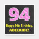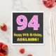 Cette conception amusante et joyeuse de serviette en papier à thème d'anniversaire comporte un grand nombre "94" avec un motif rayé rose foncé et rose clair contenant des formes cardiaques. Il comporte également le message de voeux d'anniversaire "Joyeux 94e anniversaire", et un nom personnalisable. Des serviettes en papier comme celle-ci pourraient être agréables à avoir lors d’une fête organisée pour célébrer le 94e anniversaire de quelqu’un. Cela pourrait aussi être un choix amusant pour quelqu'un dont l'anniversaire tombe le jour de la Saint-Valentin (le 14 février), en raison de ses symboles et couleurs de coeur aimés. [~Z0000436]