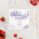 Serviettes de cocktail personnalisées de mariage d'hiver avec design pittoresque d'aquarelle dans les tons lavande et gris. La scène de la neige présente un paysage de montagne romantique avec des pins, des dérives et une légère neige. Le modèle est configuré pour ajouter les noms de la mariée et du marié ainsi que la date du mariage. Si vous souhaitez faire correspondre des produits, s'il vous plaît parcourez ma collection de forêt d'hiver.