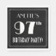 Ce design design design de papier de fête de quatre-vingt-dix-septième anniversaire comporte un nom modifiable, un look art déco fantaisie inspiré du numéro "97th", le message "BANTHDAY PARTY!", et une bordure multi-lignes. Il y a un arrière - plan de couleur noire par défaut, mais il peut être customisé à une couleur différente, si désiré. Des serviettes en papier sur le thème de l’anniversaire comme celles-ci pourraient être utilisées lors d’une fête d’anniversaire célébrant le quatre-vingt-dix-septième anniversaire de quelqu’un. [~Z0000612]