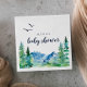 Ces serviettes de baby shower de montagne rocheuses sont parfaites pour un baby shower extérieur. Le design comprend un paysage sauvage peint en bleu et vert avec des pins d'aquarelle, des oiseaux et des montagnes. Personnalisez les serviettes avec le nom de la future maman.