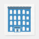 Dehors de l'avant de l'hôtel bleu avec beaucoup de fenêtres. Ce design semble vraiment efficace sur ces serviettes en papier