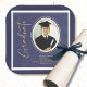 Personnalisez votre fête de remise de diplômes avec cette serviette en papier bleu marine. Il présente Graduate dans un script en or gras. Un ovale Gold, Navy et White encadre une photo du diplômé. Les détails de la journée peuvent être customisés. Les couleurs sont parfaites pour les diplômés en sciences infirmières et en médecine.