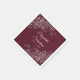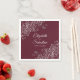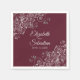 Ces belles serviettes feront de votre réception de mariage quelque chose de spécial. Elles présentent un design simple mais élégant avec du texte gris pâle sur un arrière - plan bordeaux ou rouge vif avec des boucles et des tourbillons en faux feuille argent en dentelle dans les coins. Personnalisez facilement avec vos noms et la date du mariage.