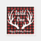 Des serviettes en papier rustiques parfaites pour une fête d'anniversaire "sauvage" d'enfant avec une silhouette de bois de cerf blanc sur le rouge et le noir et vos textes personnalisés.