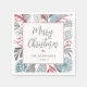 Le design moderne présente une verdure de Noël fantasque autour de la serviette en papier recouverte d'une boîte blanche. Joyeux Noël en écriture calligraphie lettrage et nom de famille, date en police moderne.