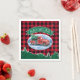 Ces serviettes de fête de vacances présentent une scène hivernale d'un camionnette rouge classique conduisant à travers la neige, un arbre de Noël frais dans le dos. Une bannière verte ci-dessus indique "Joyeux Noël" dans la typographie moderne. L'arrière - plan est un motif en plaid de buffle rouge et noir avec une bordure de pins verts et un arrosage de neige.