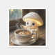 Une jolie créature aux allures de champignons avec un casquette brillant se tient à côté d'une tasse de café vapeur, en la remuant avec une cuillère