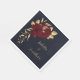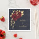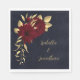 Chic et élégant nappe en papier bleu marine mariage avec de belles fleurs bordeaux et quelques feuilles dorées élégantes .