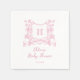 Mignons serviettes de baby shower d'inspiration vintage rose rose avec un crête de monogramme floral dessiné à la main avec des papillons et une police manuscrite décalée.