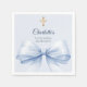 A light blue background color. Decorated with a large light blue colored bow and a golden cross. Personalize and add the name and date.
