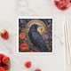 Serviettes en papier avec corneille noire. Une arche jaune derrière. Entouré de fleurs rouges et violettes. L'ambiance gothique cool.